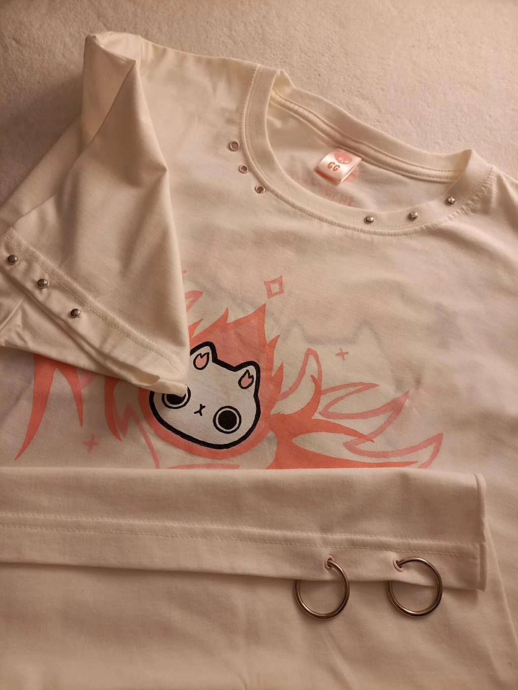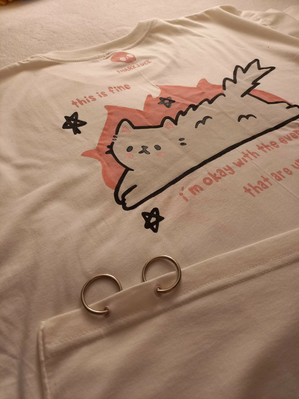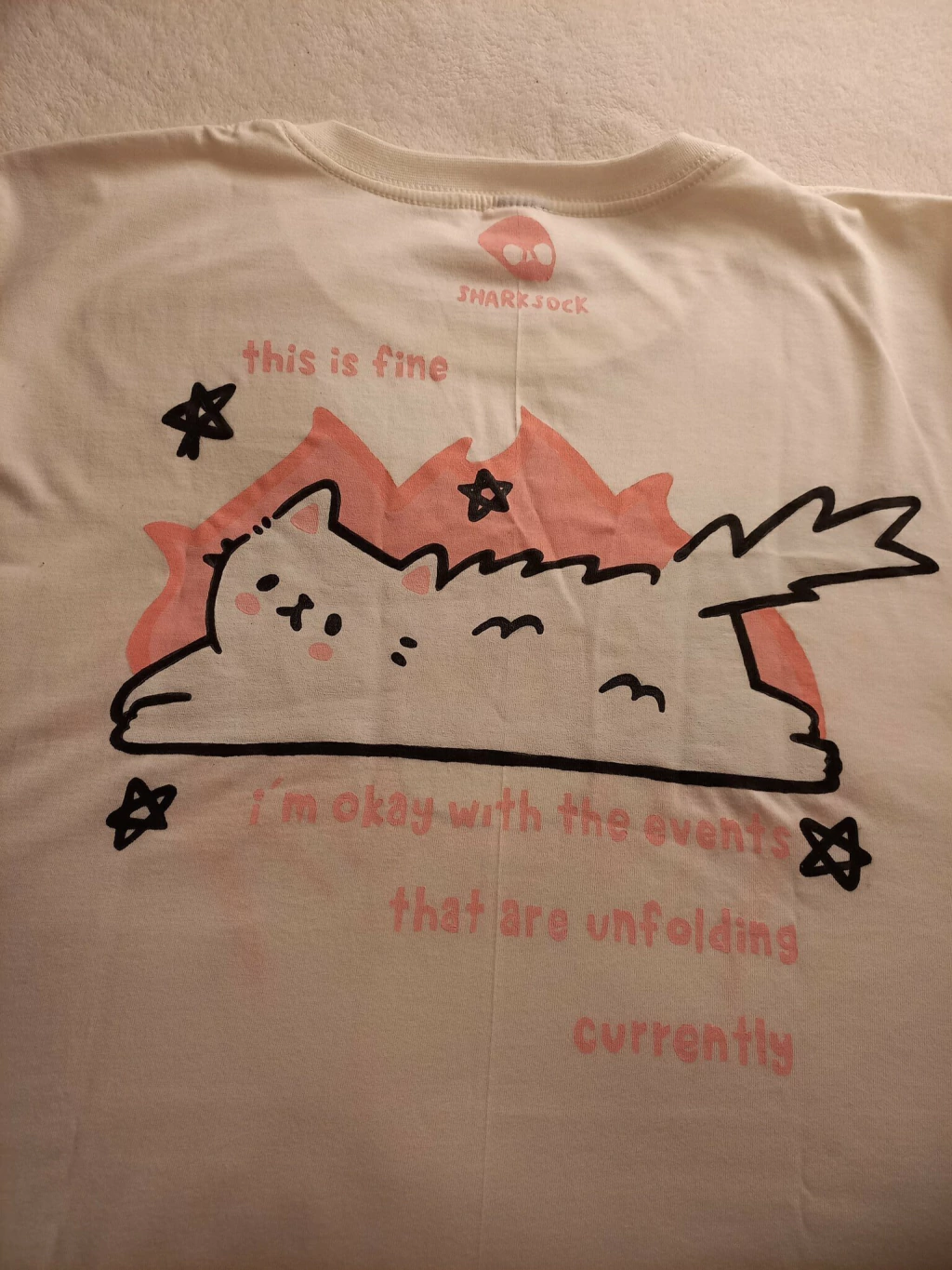 Camiseta estampa original Sharksock This Is Fine! Pintado à mão com tinta de tecido. 100% Aglodão, sob encomenda.